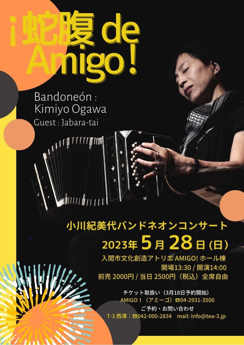 来たる5月28(日)に、T-3が企画したバンドネオンコンサート “¡蛇腹 de Amigo!”を入間市の文化創造アトリエ アミーゴにて開催します!