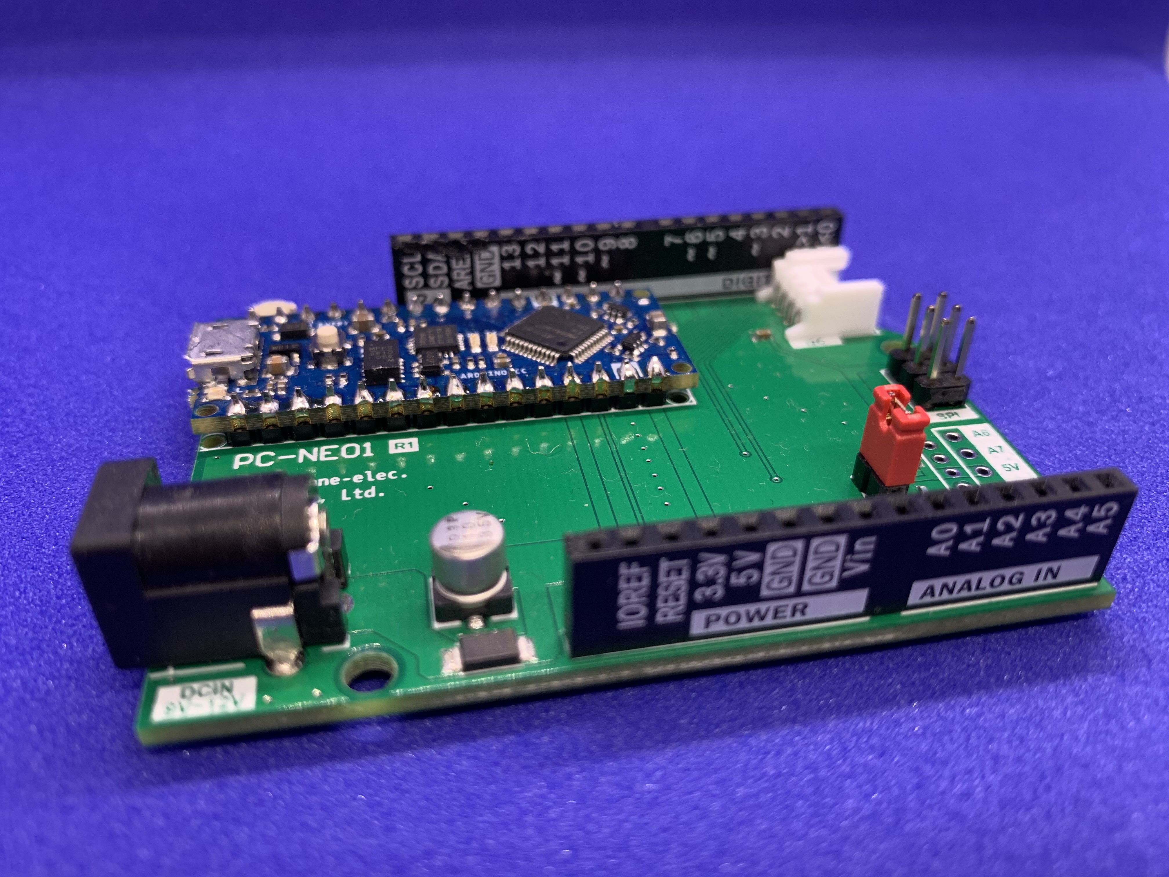 Arduino Uno R3よりも強力で5V対応できる、Arduino Nano Every(ピンヘッダ未実装)をマイコン部分に使用しています。Arduinoのピン配置に揃えるためのボードとして、 PC-NE01 ピン配置変換ボード を使用しています。これによって、Arduinoの拡張ボードの資産が有効活用出来ました。