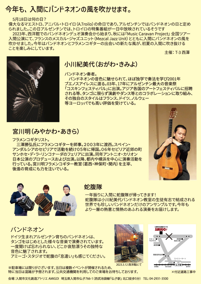 偉大なるマエストロ、アニバル・トロイロ(A.Troilo)の命日であり、アルゼンチンではバンドネオンの日と定め られました。この日アルゼンチンでは、トロイロの特集番組が一日中放映されているそうです 2023年、西洋館でのバンドネオンデュオ演奏会から始まり、秋には『Music Caravan Project』 全国ツアー 入間公演にて、フランスのメスカル・ジャズユニット(Mezcal Jazz Unit)とともに入間にバンドネオンの風を 吹かせました。今年はバンドネオンとフラメンコギターの出会いの新たな風が、初夏の入間に吹き抜ける ことを楽しみにしています。
